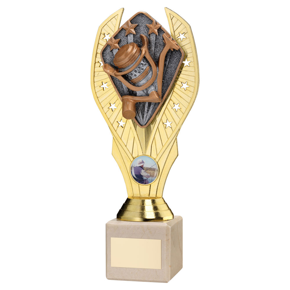 Gold Plastic Holder + Angling Disc On Cream Marble Trophy (1in Cen) - 8.25in