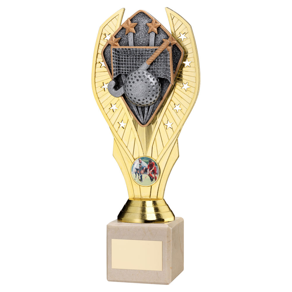 Gold Plastic Holder + Hockey Disc On Cream Marble Trophy (1in Cen) - 8.25in