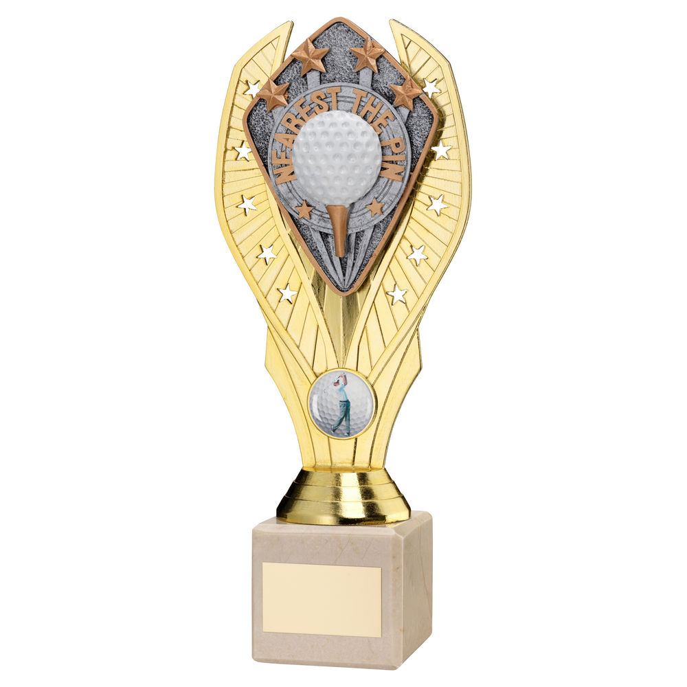 Gold Plastic Holder+nearest The Pin Disc+cream Marble Trophy (1in Cen) - 7.75in