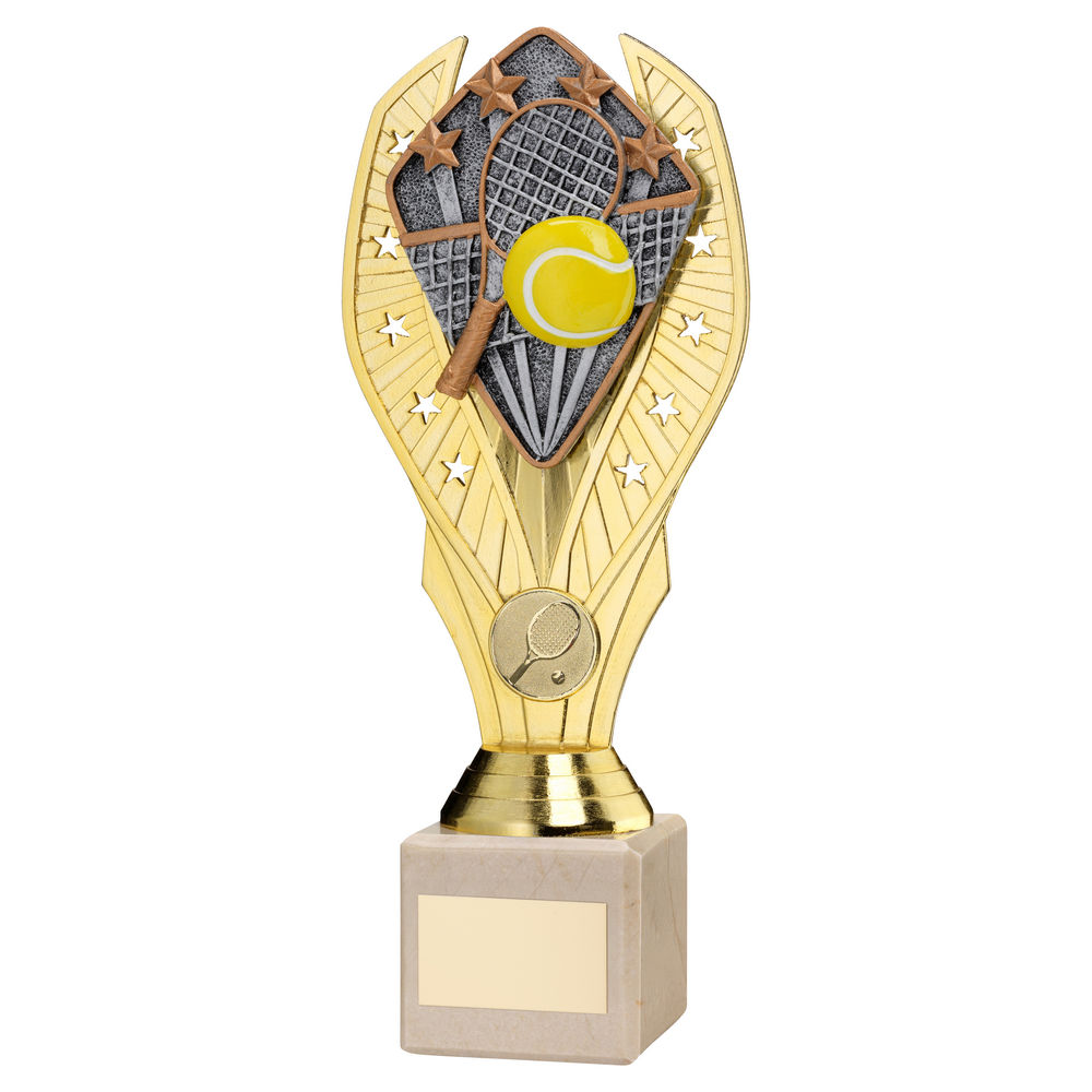 Gold Plastic Holder + Tennis Disc On Cream Marble Trophy (1in Cen) - 8.25in