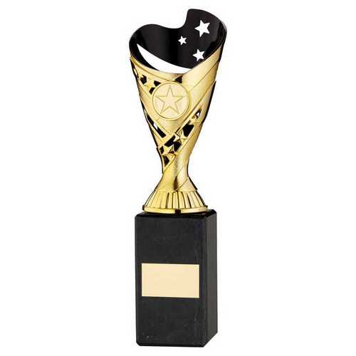 Gold|blk Plastic Sabre Cup On Blk Marble Assembled Trophy (1" Cen) - 8in