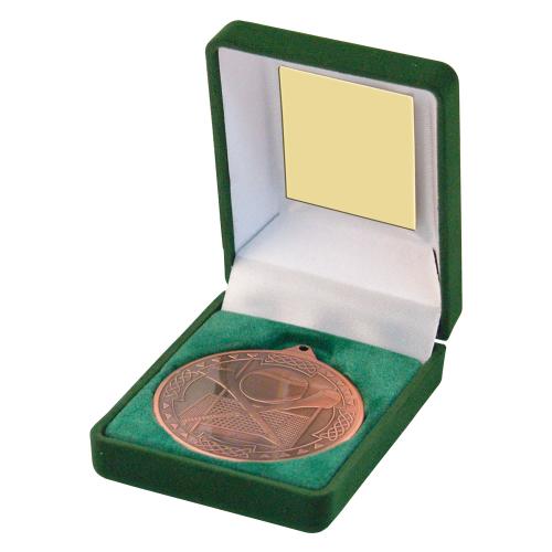 Green Velvet Box And Hurling 50mm Medal Trophy Bronze - 3.5in