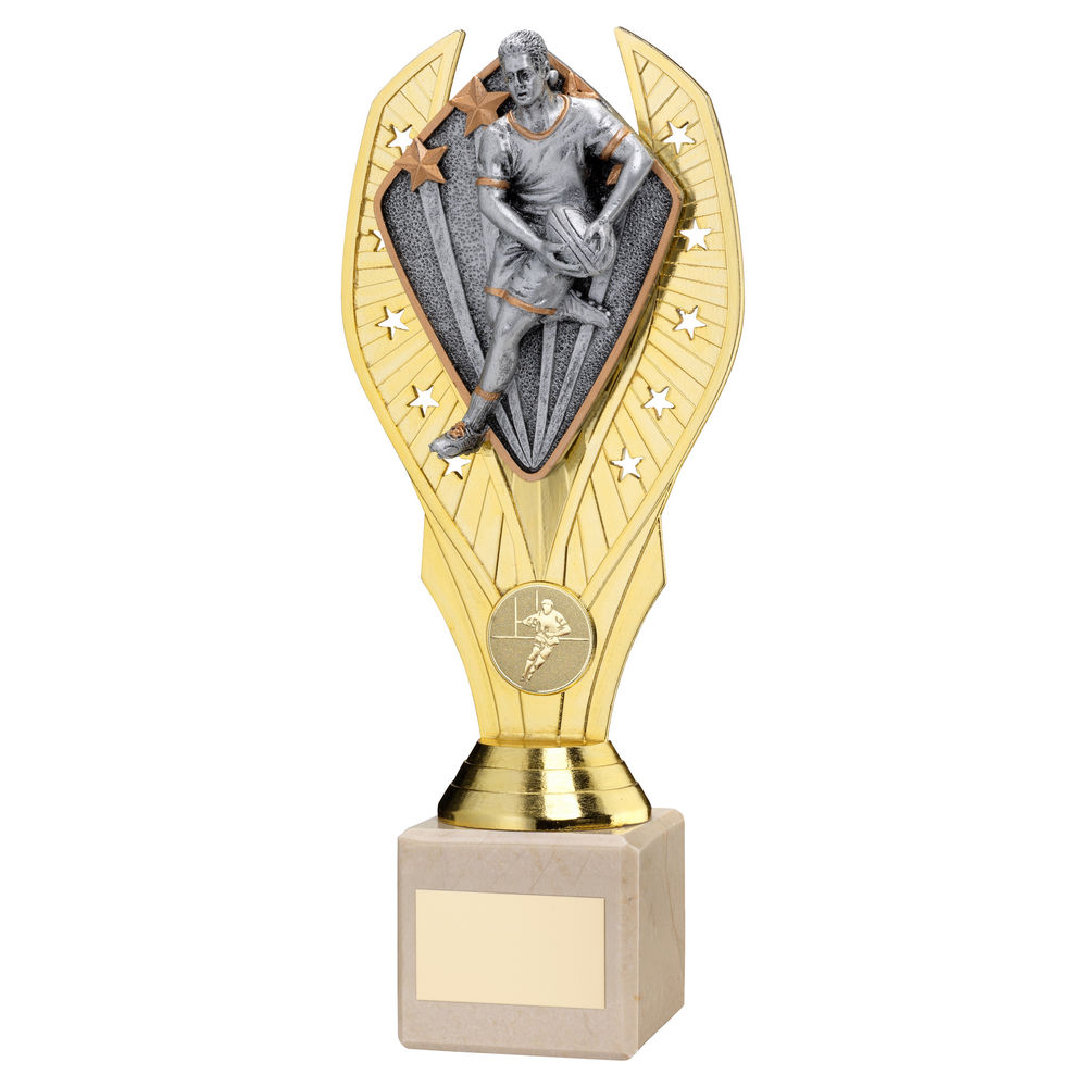 Gold Plastic Holder + Male Rugby Disc On Cream Marble Trophy (1in Cen) - 11in