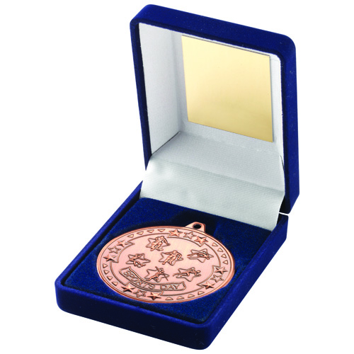 Blue Velvet Box And 50mm Sports Day Medal Trophy Bronze - 3.5in