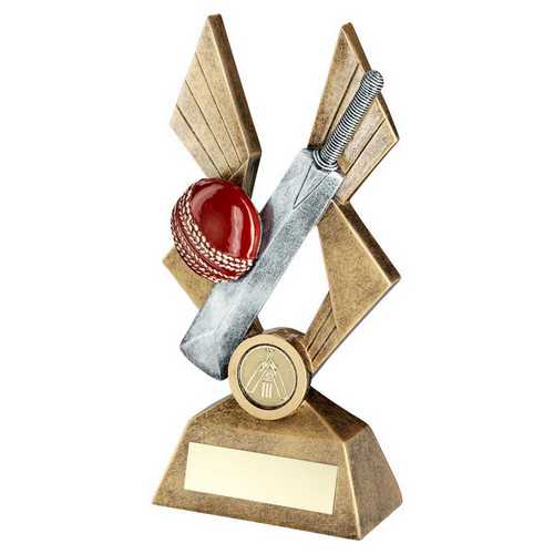 Brz|pew|red Cricket Ball And Bat On Pointed Backdrop With Plate (1in Cen) - 6in