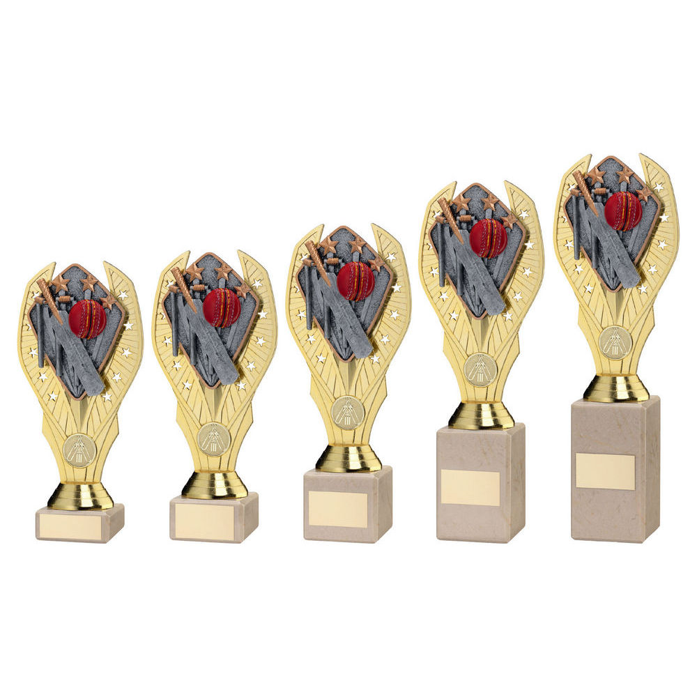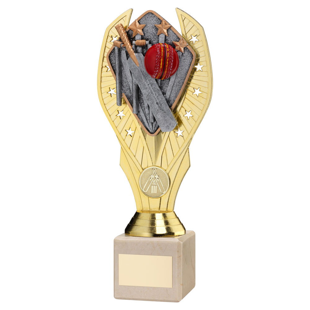 Gold Plastic Holder + Cricket Disc On Cream Marble Trophy (1in Cen) - 8.25in