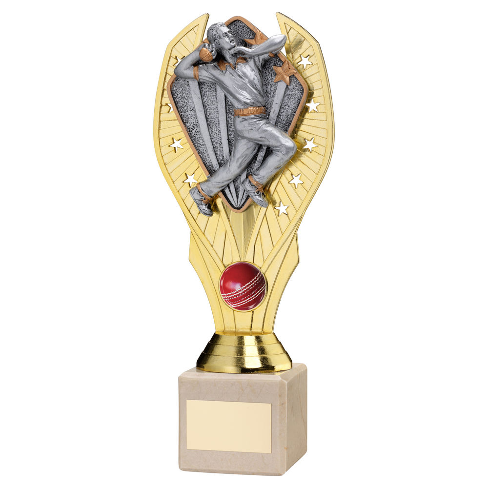 Gold Plastic Holder+cricket Bowler Disc & Cream Marble Trophy (1in Cen) - 11in