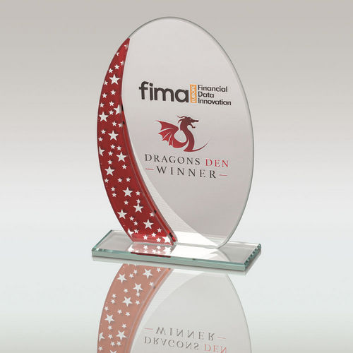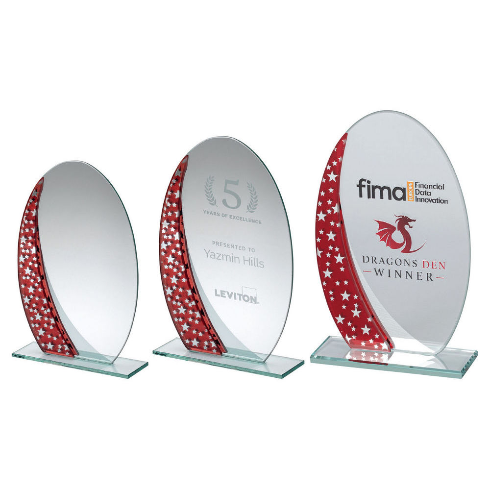 Jade Glass Oval Plaque With Red|silver Star Design (4mm Thick) - 7.25in