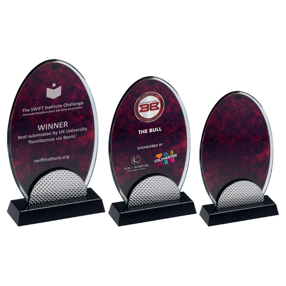 Red Marble Backed Clear Glass Oval With Silver Detail And Black Base - 7in
