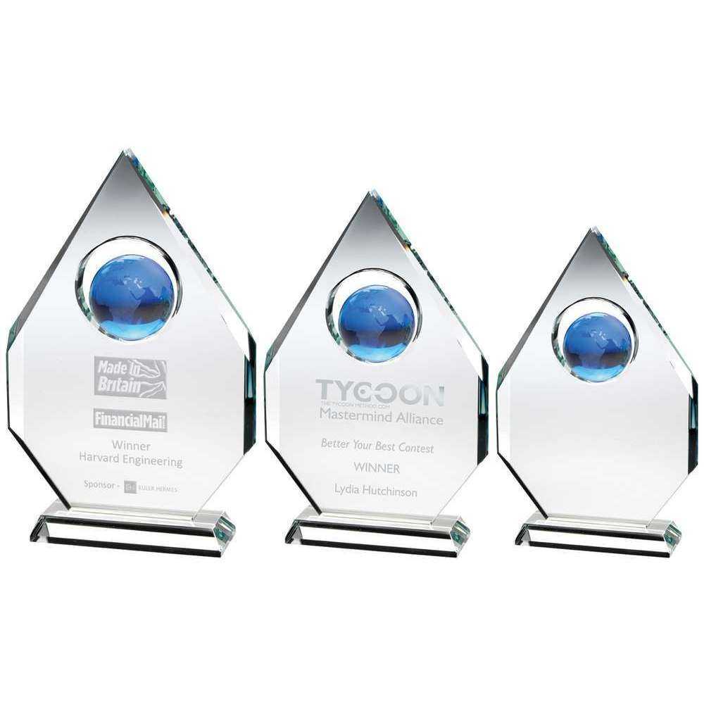 Clear Glass Diamond Plaque With Blue Globe - (15mm Thick) 11in