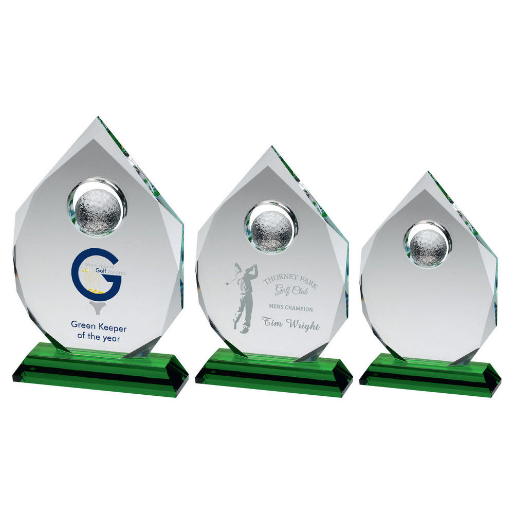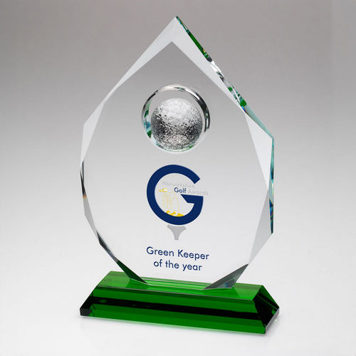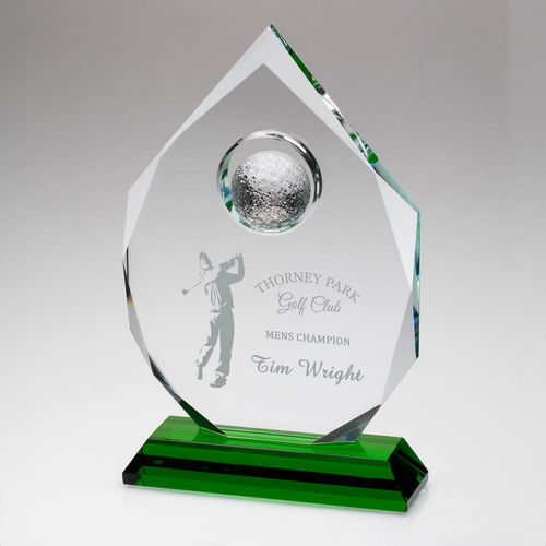 Clear Glass Diamond With Golf Ball On Green Base (15mm Thick) - 8in