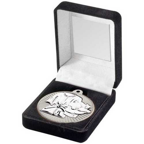 Black Velvet Box And 50mm Martial Arts Medal Trophy Matt Silver|bronze - 3.5in