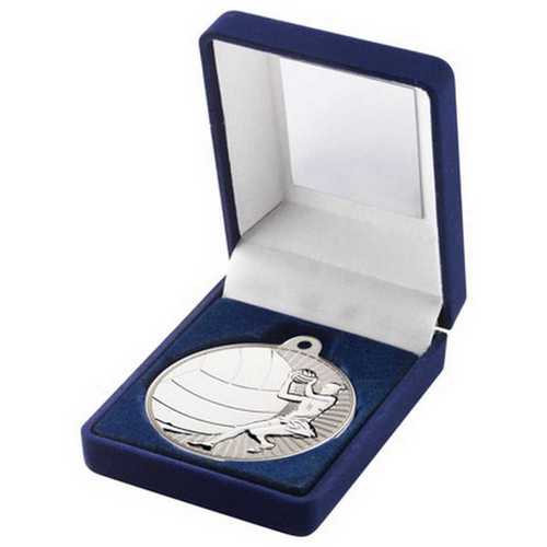 Blue Velvet Box And 50mm Netball Medal Trophy Matt Silver|silver - 3.5in