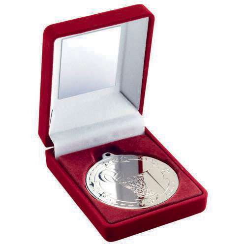 Red Velvet Box And 50mm Medal Netball Trophy Silver - 3.5in
