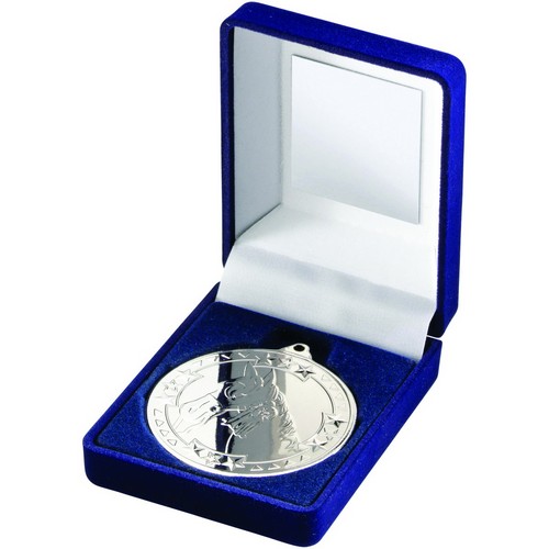 Blue Velvet Box And 50mm Medal Horse Trophy Silver - 3.5in