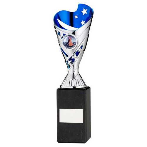 Silver|blue Plastic Sabre Cup On Blk Marble Assembled Trophy (1" Cen) - 9in