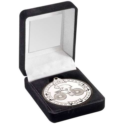 Black Velvet Medal Box And 50mm Medal Cycling Trophy Silver - 3.5in
