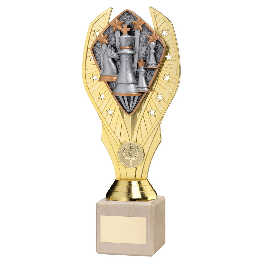 Gold Plastic Holder + Chess Disc On Cream Marble Trophy (1in Cen) - 8.25in