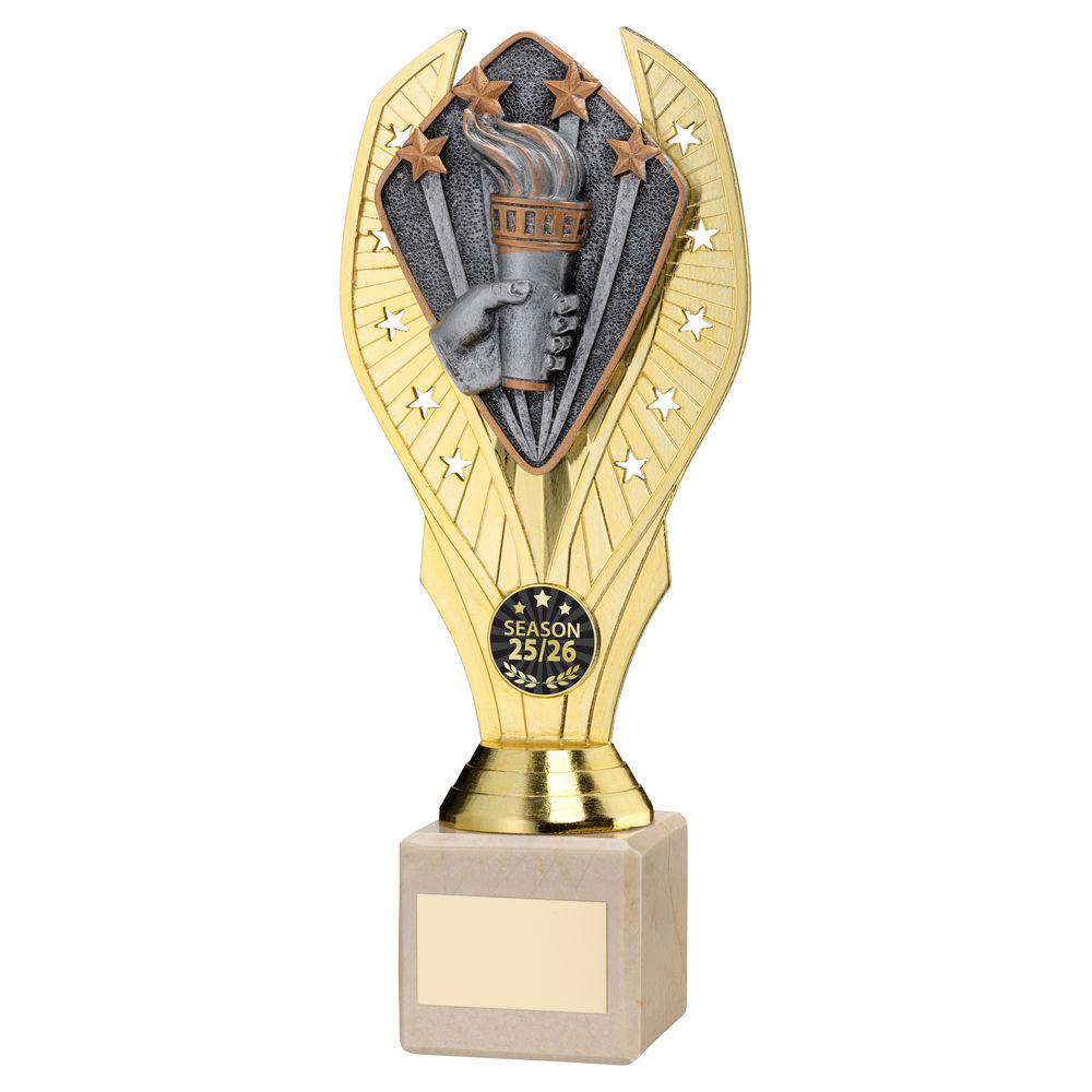 Picture of Gold Plastic Holder+victory Torch Disc On Cream Marble Trophy (1in Cen) - 11in Picture of Gold Plastic Holder+victory Torch Disc On Cream Marble Trophy (1in Cen) - 11in